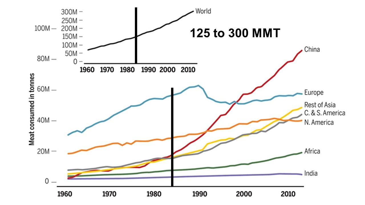 In just 30 years (1982 to 2012) global meat consumption has increased from 125 to 300 million metric tons.